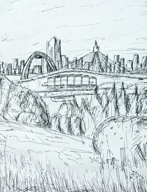 Работа выполнена в технике графика с помощью черной гелиевой ручки. На ней изображен вид с самой высокой и живописной точки района Крылатское - Крылатских холмов. Отсюда хорошо видны ледовый дворец и Живописный мост через Москву-реку. А за рекой очертания жилых высотных домов. Крылатские холмы - это природный заповедник и излюбленное место для всех жителей района.