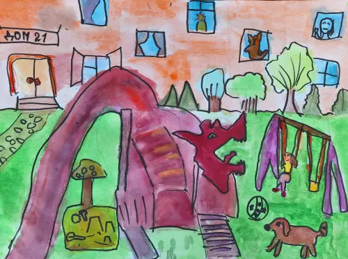 На моем рисунке изображена лучшая площадка в Митино! Она находится на Пятницком шоссе. Это всем известный Красный дракон! Я обожаю скатывается с этой "драконьей" горки. Мне очень нравится она, потому что она высокая. Там есть труба, в которой мне интересно лазать. Рядом изображена песочница, в которой я уже слепила много куличей. А ещё я люблю качели. На рисунке я сижу и качаюсь. Приглашаю всех гулять на мою замечательную площадку!