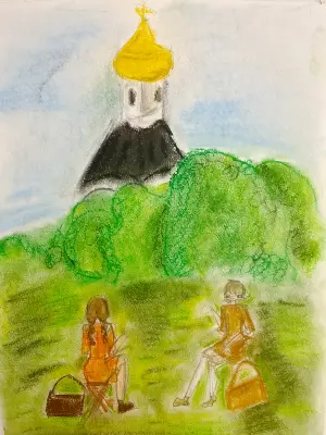 На уроке пленэре дали задание нарисовать храм. Мы с подругой решили, что наш храм, который находится в Крылатском, очень подходит для рисунка. Посмотрите какой он великолепный.