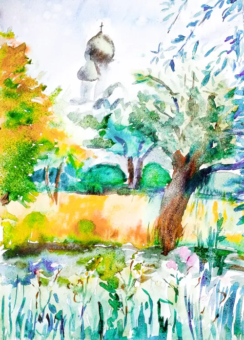 На рисунке изображено местечко недалеко от нашего дома. На берегу речки красивый храм, он новый. Мы часто ходим в него на службы. Захотелось запечатлеть кусочек своей жизни.