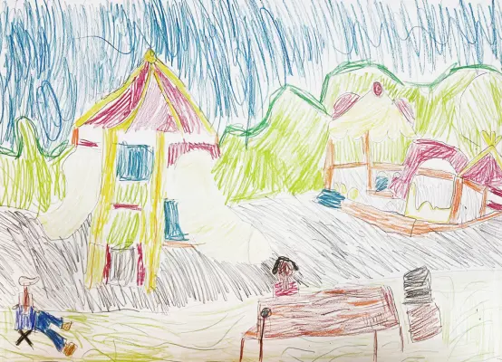 На рисунке, выполненном цветными карандашами, изображена моя любимая детская площадка на улице Осенней. В центре находится самая красивая горка-труба. Справа от горки домик с песочницей. На лавочке сидит моя старшая сестра Маша.