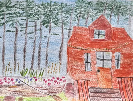 Я живу рядом с Серебряным Бором - это моё любимое место, я люблю там гулять с мамой и нашей собакой. И там есть домик моей мечты, который я нарисовала.