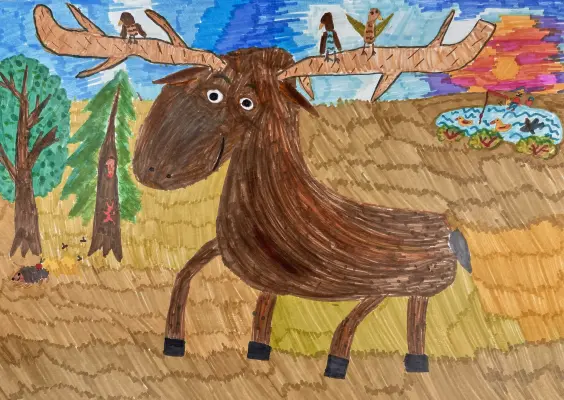 В моём районе расположен национальный парк «Лосиный остров». На своём рисунке я изобразила обитателей парка: лося, белок, птичек, ёжика. Ещё добавила пруд с уточками и рыбаком. Я люблю там гулять. Ценю и горжусь, что такое чудесное место есть в моём районе!