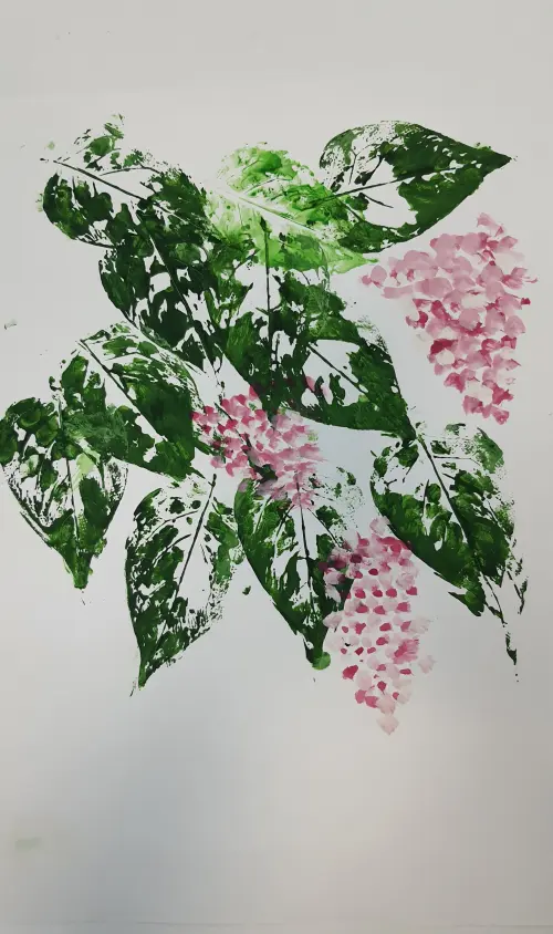 Плетешковский переулок расположен рядом с моей школой и домом, поэтому я решил нарисовать прекрасную сирень, которая так красиво цвела этой весной и радовала всех. Я использовал необычную технику рисования «стэмпинг».
