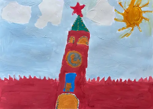 Записано со слов ребенка: "Мы с мамой ездили на специальную экскурсию для детей на Красную Площадь. Там я видел длинную красную стену и высокую Спасскую башню. На не есть куранты - огромные часы. И огромная звезда. А лучик ее такой, что размером с любого папу. Пять лучиков - пять пап могут там поместиться. Когда мама сказала, что для конкурса нужен рисунок про Москву, я нарисовал башню."