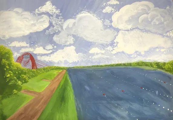 Работа выполнена гуашью. На ней изображён самый большой гребной канал в Москве с видом на Живописный мост. На Гребном канале часто проходят тренировки и соревнования по гребле на байдарках и каноэ. Мой средний брат как раз занимается греблей, и я часто посещаю это место.