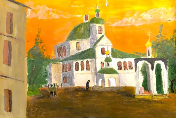 Я пытался передать на картине атмосферу заката. Тишину после службы. Схимонаха, безмолвно возвращающегося в храм. И двух казаков, смотрящих за порядком.