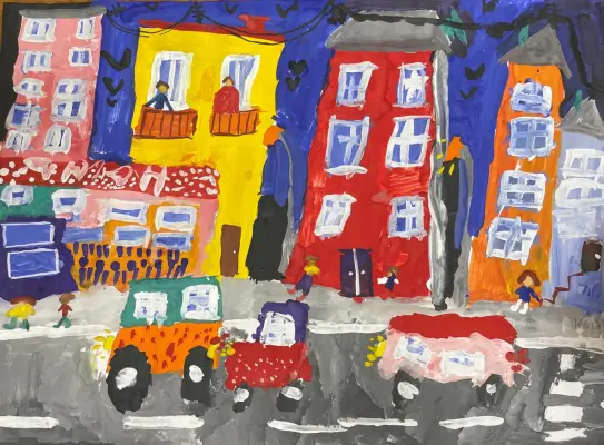 На моей улице всегда оживленно: едут машины и автобусы, бегут люди по своим делам, взрослые на работу, дети в школу. У нас дом высокий, можно с балкона увидеть все вокруг и помахать прохожим рукой.