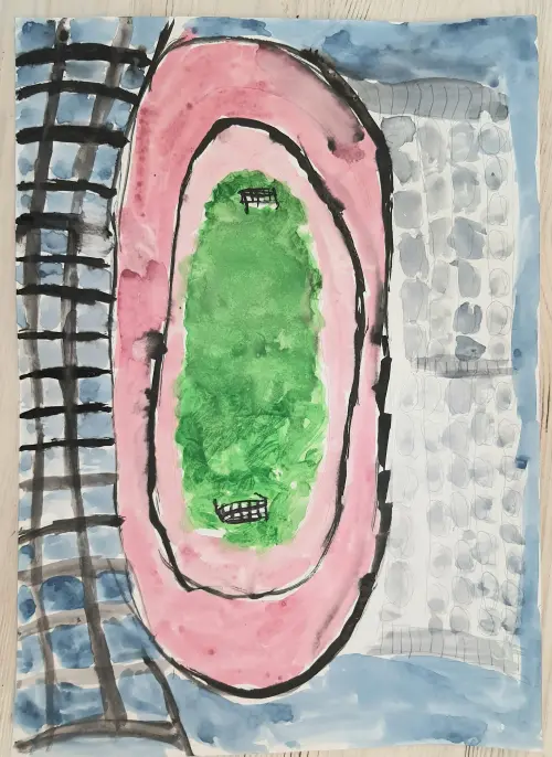 Мне очень нравится гулять в Лефортовском парке. Я очень люблю спорт и регулярно занимаюсь бегом вместе со своим братом на этом стадионе. Поэтому мне захотелось его нарисовать.