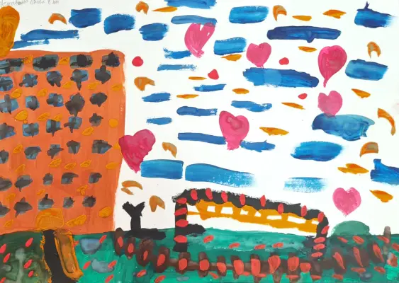 Рисунок выполнен яркими красками. Он передаёт атмосферу радости и счастья, которые испытываю я, находясь в своём дворе. Для меня это место, где я чувствует себя в безопасности и может быть собой. Здесь я провожу много времени со своими друзьями и близкими.