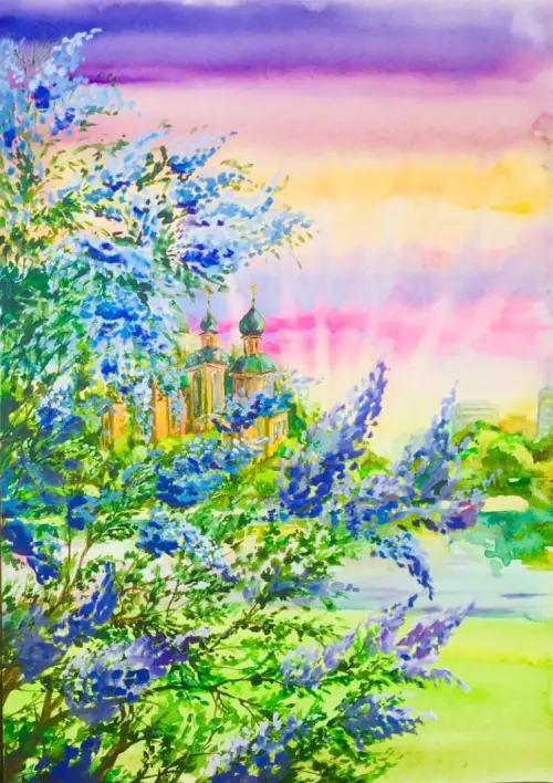Техника «Живопись», акварель. На рисунке изображён Храм в лучах восходящего солнца. На переднем плане-распустившееся майская сирень. Техника «Живопись», акварель. На рисунке изображён Храм в лучах восходящего солнца. На переднем плане-распустившееся майская сирень.