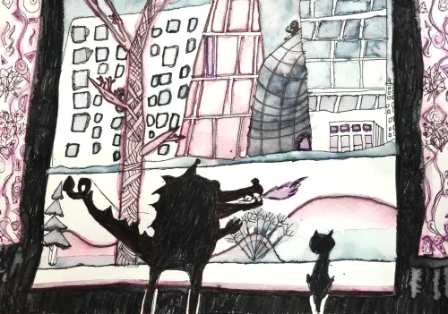 Работу рисовали в клубе «Артград». Учитель просил создать образ городской современной застройки с настроением перед Новым Годом. Именно поэтому Арина нарисовала Дракончика (год Дракона), который пришёл к своему другу Котёнку. Любимое их занятие стоять у окна и наблюдать, что происходит во дворе. А там ёлка, на крыше катается ворона — она тоже радуются наступающему празднику.