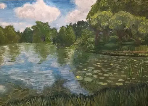 Техника "живопись", гуашь. На рисунке изображён пейзаж среднего Чернёвского пруда с жёлтыми лилиями и отражающимся небом.