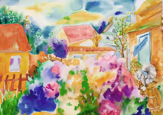 На рисунке изображён утопающий в цветах и зелени московский дачный посёлок «Потапово». Техника-живопись, акварель.