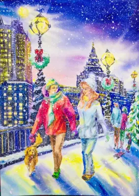 Техника-живопись, акварель. Картина написана под впечатлением ребёнка от вечерней прогулки с родителями.