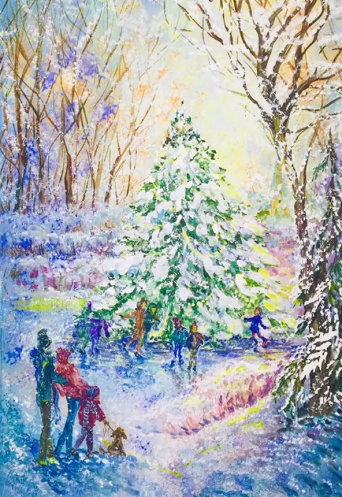 Техника – живопись, гуашь. На рисунке ребёнка изображён отдых с семьёй и домашнем питомцем в зимние каникулы.