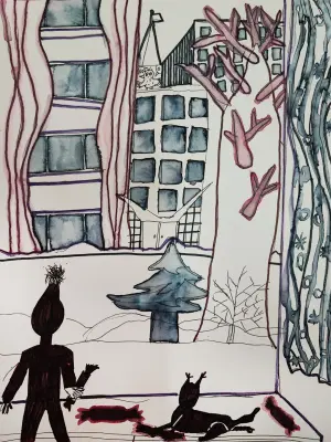 Работа выполнялась в досуговом клубе Артград. По заданию педагога надо было изобразить новую застройку района и передать предновогоднее настроение.