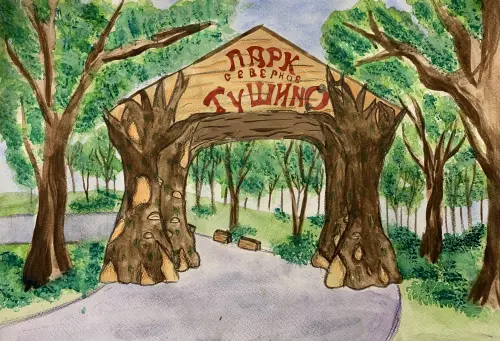 Мы часто с семьей гуляем в парке «Северное Тушино», там есть красивые сказочные скульптуры. Особенно мне нравится вход в парк, поэтому я его и нарисовала.