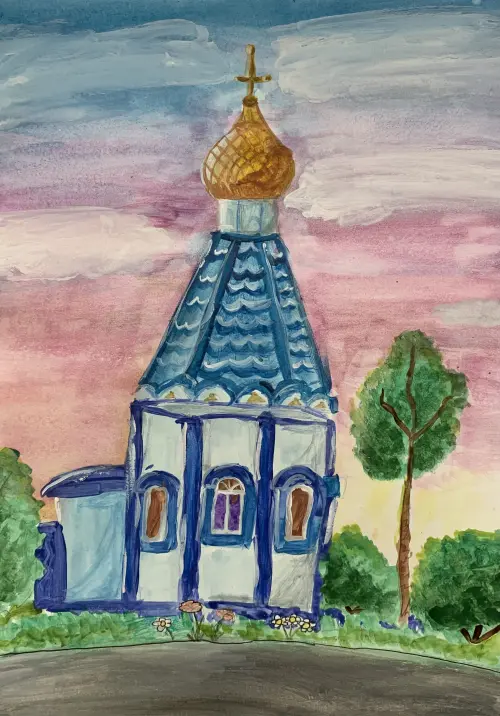 Я часто с родителями гуляю в сквере, где располагается Часовня Димитрия Донского. Она привлекла мое внимание своим бело-синим фасадом. На своем рисунке я передала это акварелью и гуашью.