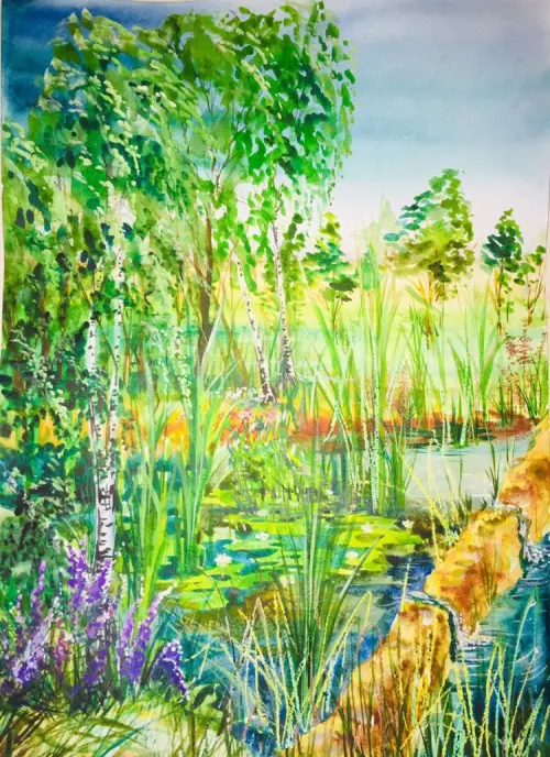 Техника-живопись, акварель. На работе изображён ступени ручья в зарослях осоки и растущими кувшинками.