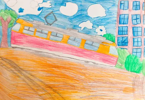 На рисунке изображен трамвай, идущий по Симферопольскому бульвару-одной из зеленых и оживленных улиц Москвы.Трамвай яркого, современного дизайна выделяется на фоне окружающей городской среды, создавая ощущение движения и динамики. Трамвай движется по специальной выделенной линии, огороженной низкими бордюрами, что обеспечивает ему беспрепятственный проезд. На рисунке изображен трамвай, идущий по Симферопольскому бульвару-одной из зеленых и оживленных улиц Москвы.Трамвай яркого, современного дизайна выделяется на фоне окружающей городской среды, создавая ощущение движения и динамики. Трамвай движется по специальной выделенной линии, огороженной низкими бордюрами, что обеспечивает ему беспрепятственный проезд.