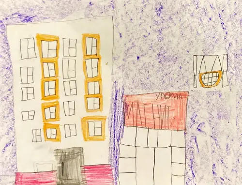 Рядом с домом магазин и детская игровая площадка с качелями, на которых очень весело качаться.На рисунке изображены дом и двор, в котором я живу.