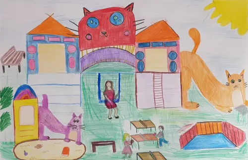 Я очень люблю кошек' поэтому решила создать площадку в стиле котиков.Я очень люблю кошек, поэтому решила создать площадку в стиле котиков. Выбрала яркие цвета, потому что детям нравится все яркое.На моем рисунке изображена игровая площадка для детей, в центре которой находится большая горка с мордочкой кошки. Постаралась нарисовать площадку яркой, потому что мне нравится все яркое как всем маленьким детям.