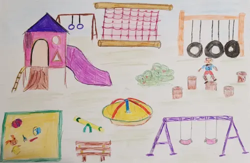 На моем рисунке изображена детская площадка. Больше эта площадка подходит для детей старше 5-6 лет, потому что много элементов с препятствиями. Также нарисовала уголок для малышей.