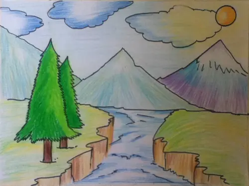 на моем рисунке нарисована природа, я люблю рисовать природу, речку и лес, потому что это выглядит всегда красиво. недавно мы были в горах и я хотел бы чтобы в моем районе была речка, где можно купаться и красивые высокие горы