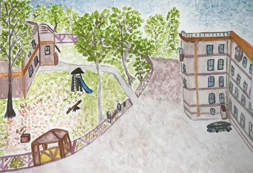 Свою работу я назвала «Мой дворик», так как он находится недалеко от моего дома, и я там часто гуляю с моими друзьями и родителями. Там много зелени, цветут цветы.