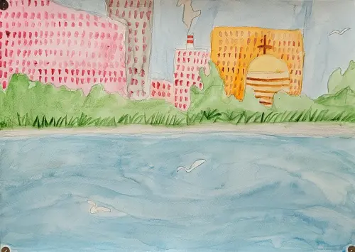 На рисунке изображен наш замечательный пруд. Летом я здесь гуляю почти каждый день, кормлю уток. Зимой часто катаюсь на коньках. Рядом с прудом есть ярмарка, карусель и прокат лодок.