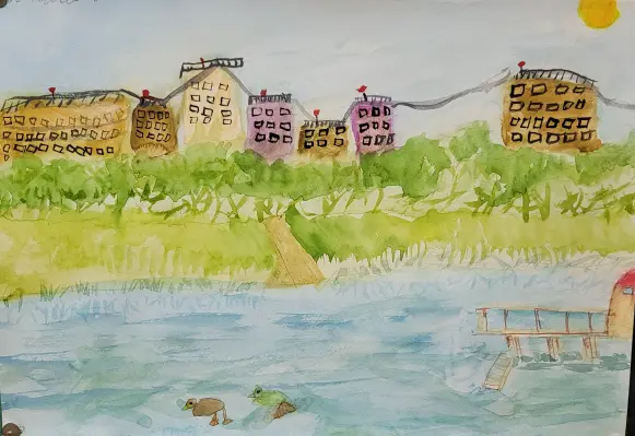 На рисунке изображен наш Бабаевский пруд. Летом мы с родителями здесь катаемся на велосипедах и устраиваем пикники, а зимой там здорово кататься на ватрушках.