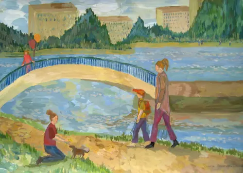 Живописная работа выполнена в технике гуашь. На работе изображена набережная Городского пруда со стороны Парка Победы в городе Зеленограде и жители Зеленограда.