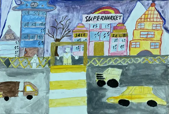 Обычное утро. Все спешат на работу. Я иду в школу.Будний день в моём районе. Обычное утро. Все спешат на работу. Машины сигналят и останавливаются перед пешеходами. Я иду в школу по пешеходному переходу. Люблю мой район и мою школу.