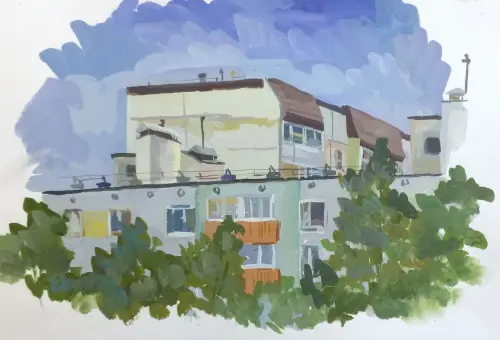 Живописная пленэрная работа выполнена в технике акварель. На работе изображена зарисовка крыш жилых домов 4 микрорайона района Матушкино города Зеленоград