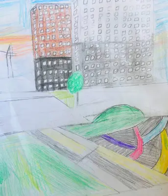 Работа написана по воспоминаниям своего любимого района, где сочетание природы — леса, неба, и современной детской площадки — с горками, качелями, турникетами, мягким покрытием, спортивными секциями для игры в футбол, баскетбол,— создает неповторимую атмосферу.