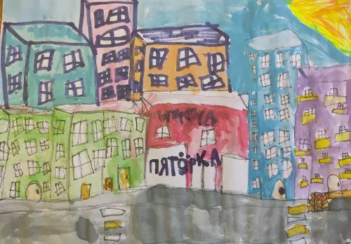 На рисунке изображена дорога к дому по которой я хожу каждый день из детского сада и в детский сад. Мимо высоких домов и магазина Пятёрочка, куда мы с мамой заходим и покупаем мне вкусняшки.