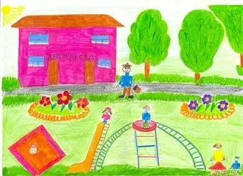 Я нарисовала свой двор. На его территории есть качели, карусели, разные спортивные тренажеры и даже волейбольная площадка. Я люблю гулять во дворе, особенно летом.