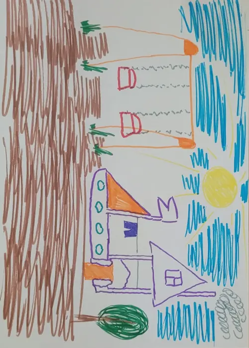 Люблю качели и горкиДобрый день! Я очень сильно люблю гулять!!! И очень сильно люблю качели( на своей разноцветной площадке) и очень люблю горки!!! Поэтому я нарисовал свой любимый двор!!!!!