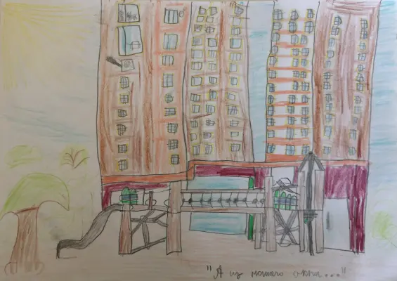 Ребенок решил нарисовать то, что он видит из окна своей комнаты. Старался передать все краски и всю архитектуру сооружений. И самое главное - изобразил свою любимую горку во дворе. Спасибо за внимание!