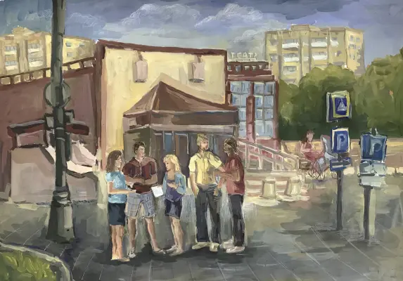 Живописная работа выполнена в технике гуашь. На работе изображены жители города Зеленограда на фоне театра "Ведогонь" - любимого места культурного воспитания жителей.