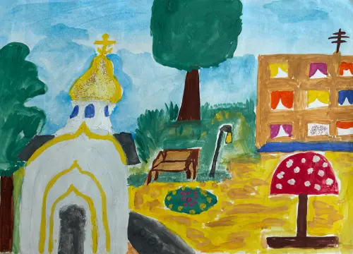Я люблю гулять около Храма Иоанна Русского. Там очень красиво, там красивый двор при храме, и даже живут белочки. Около храма есть красивые детские площадки. Именно это я и нарисовала на своем рисунке.