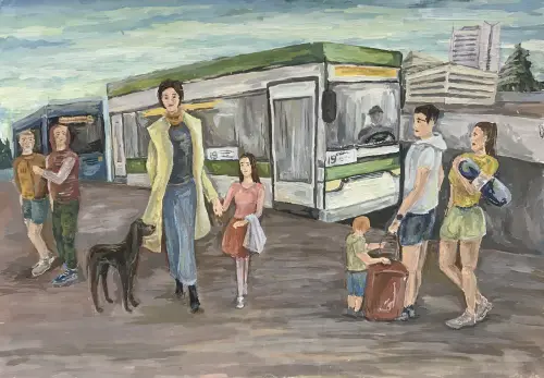 Живописная работа выполнена в технике гуашь. На работе изображены жители города Зеленограда на фоне городских построек и общественного транспорта. "Желтый плащ" притягивает внимание не только людей, изображенных на работе.