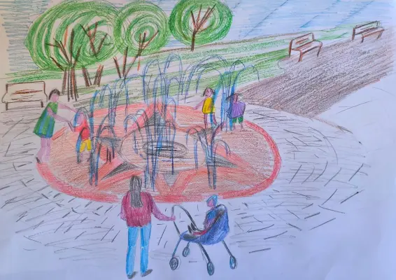 В моем районе есть очень уютное и красивое место - сквер. В сквере находится сцена, и каждый четверг летом там показывают мультики и кино. Еще там есть фонтан, где мы с ребятами веселимся.