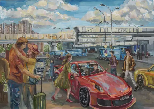 Работа выполнена в технике гуашь. На живописной работе изображены жители города Зеленоград недалеко от железнодорожной станции «Крюково». Кто-то встречает родных после дальнего путешествия, а кто-то наоборот провожает. Работа трогает своей многозначностью и завораживает множеством деталей.