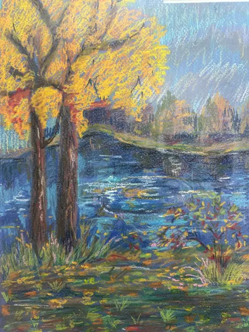 На залитой солнцем лужайке, трава уже почти утратила естественный зелёный цвет. Под палящими лучами солнца она приобрела золотистый оттенок. Величавые деревья, растущие за прудом на дальнем плане, создают ощущение приятной прохлады густого старого парка в знойный день.