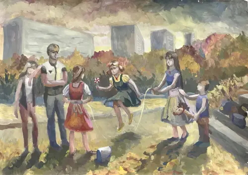 Работа выполнена в технике гуашь. На работе изображены дети, жители города Зеленограда, гуляющие после окончания уроков в школе, пока еще не испортилась погода. На работе хорошо видно, насколько красива природа родного города в осеннее время года.