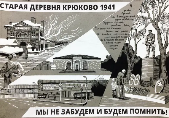 Графическая работа выполнена в технике цветная бумага, гуашь, черная гелиевая ручка. Плакат. На работе изображены две исторические эпохи: военное время 1941 года и настоящее время.