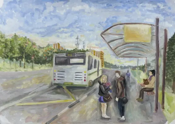 Работа выполнена в технике гуашь. на работе хотелось изобразить долгожданную встречу девушки и молодого человека. Они встретились на автобусной остановке в городе Зеленограде