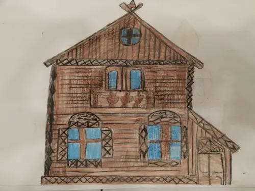 Когда наступают летние каникулы, я приезжаю к бабушке в деревню, которая находится в Рязанской области. Сейчас конечно в деревне в основном новые современные дома, но есть и старые деревянные, которые мне очень понравились! Выглядят такие дома очень богато, деревянные окна различной формы с двойными ставнями и наличниками красиво декорированы разным орнаментом. Поэтому я решил запечатлеть деревянный дом в виде рисунка, представляя его как дом моей мечты!